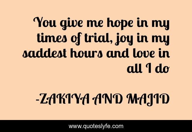 This page presents the quote "You give me hope in my times of trial, joy in my saddest hours and love in all I do". Author of this quote is ZAKIYA AND MAJID. This quote is about love, affection,.