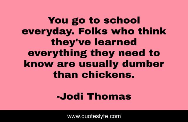 This page presents the quote "You go to school everyday. Folks who think they've learned everything they need to know are usually dumber than chickens.". Author of this quote is Jodi Thomas. This quote is about education, wisdom,.