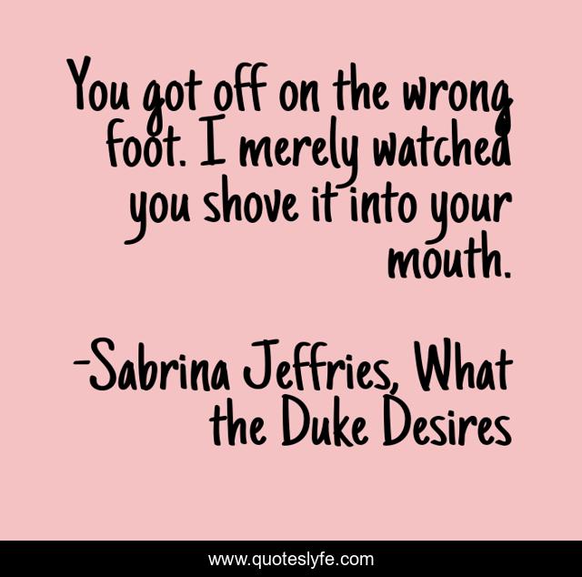 This page presents the quote "You got off on the wrong foot. I merely watched you shove it into your mouth.". Author of this quote is Sabrina Jeffries, What the Duke Desires. .