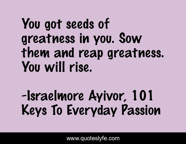 This page presents the quote "You got seeds of greatness in you. Sow them and reap greatness. You will rise.". Author of this quote is Israelmore Ayivor, 101 Keys To Everyday Passion. This quote is about great, you-will-rise, rise, food-for-thought, quotes, seed, greatness, personal-development, israelmore-ayivor,.