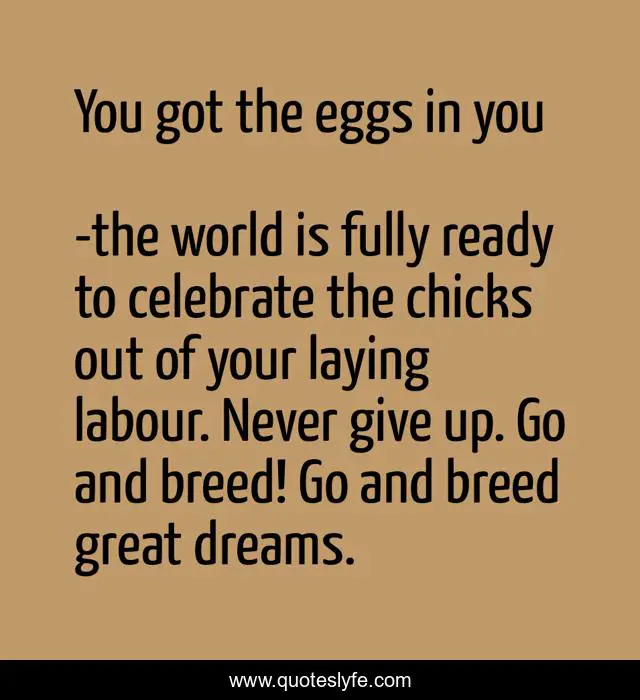 "the world is fully ready to celebrate the chicks out of your laying labour. Never give up. Go and breed! Go and breed great dreams. Quotes." Quoteslyfe.com, 2025. Fri. 05 Dec. 2025. <https://www.quoteslyfe.com/quote/You-got-the-eggs-in-you-89191>.