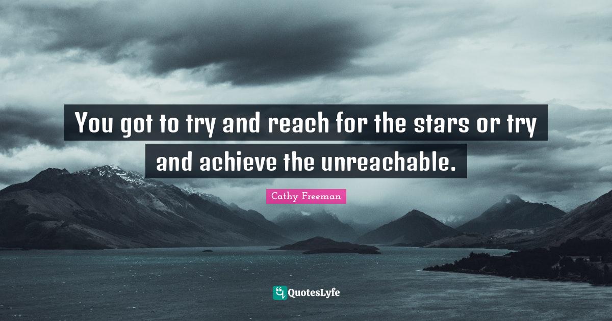 This page presents the quote "You got to try and reach for the stars or try and achieve the unreachable.". Author of this quote is Cathy Freeman. This quote is about achieve, stars, motivational, track, unreachable,.