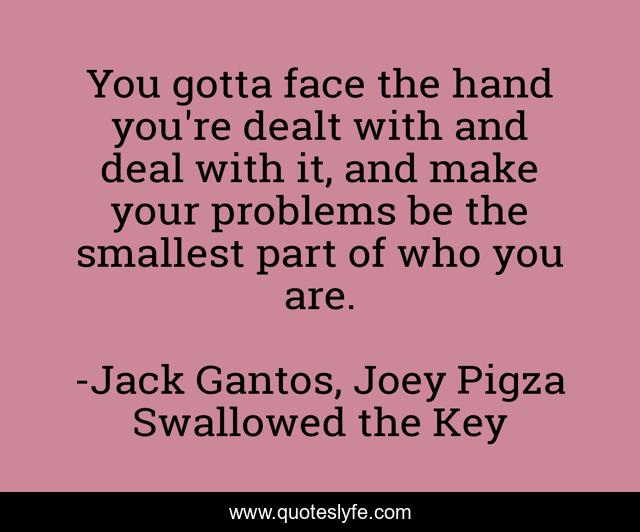This page presents the quote "You gotta face the hand you're dealt with and deal with it, and make your problems be the smallest part of who you are.". Author of this quote is Jack Gantos, Joey Pigza Swallowed the Key. This quote is about problems, life-lessons,.