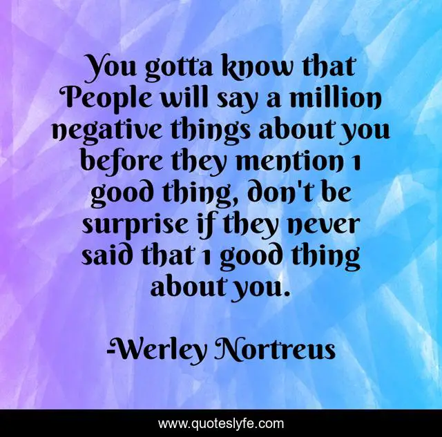 This page presents the quote "You gotta know that People will say a million negative things about you before they mention 1 good thing, don't be surprise if they never said that 1 good thing about you.". Author of this quote is Werley Nortreus. This quote is about negative-people, haters, ignorance, negative-thoughts,.