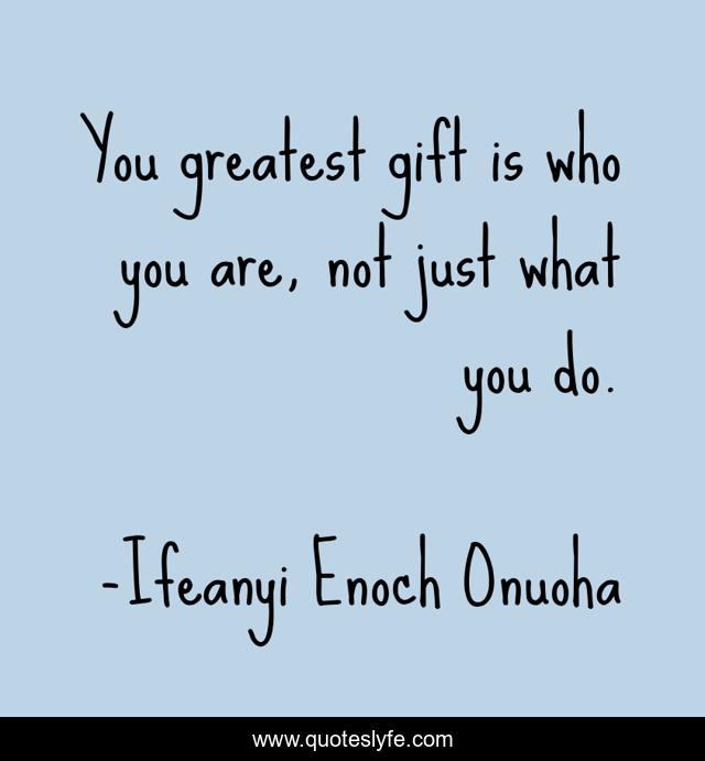 This page presents the quote "You greatest gift is who you are, not just what you do.". Author of this quote is Ifeanyi Enoch Onuoha. This quote is about confidence, hinovelty, quote, motivational, ifeanyi-enoch-onuoha, optimistic, positive,.