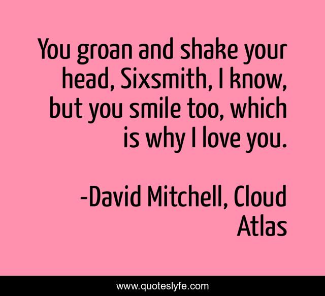 This page presents the quote "You groan and shake your head, Sixsmith, I know, but you smile too, which is why I love you.". Author of this quote is David Mitchell, Cloud Atlas. .