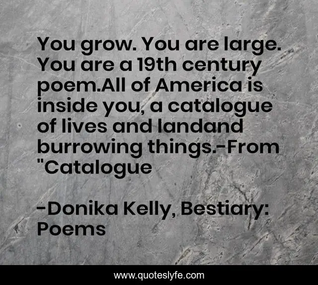 This page presents the quote "You grow. You are large. You are a 19th century poem.All of America is inside you, a catalogue of lives and landand burrowing things.-From "Catalogue". Author of this quote is Donika Kelly, Bestiary: Poems. This quote is about be-you, self, poetry, find-yourself, like-whitman, you-be-you,.
