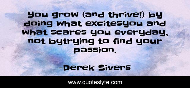 This page presents the quote "You grow (and thrive!) by doing what excitesyou and what scares you everyday, not bytrying to find your passion.". Author of this quote is Derek Sivers. This quote is about life, goal, lost, passion, goals, changing, find,.