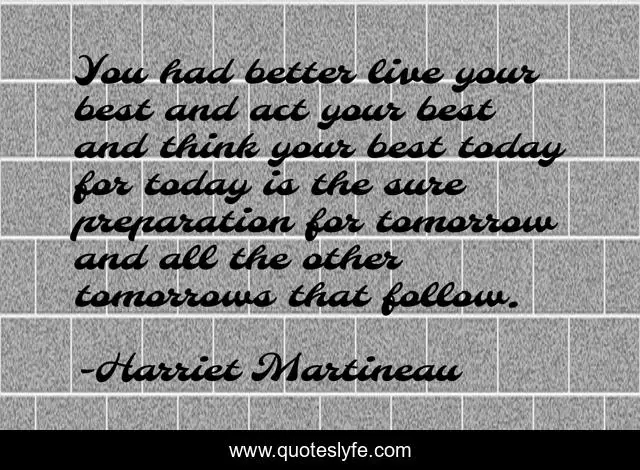 This page presents the quote "You had better live your best and act your best and think your best today for today is the sure preparation for tomorrow and all the other tomorrows that follow.". Author of this quote is Harriet Martineau. .