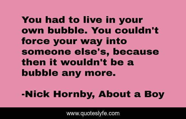 This page presents the quote "You had to live in your own bubble. You couldn't force your way into someone else's, because then it wouldn't be a bubble any more.". Author of this quote is Nick Hornby, About a Boy. This quote is about relationships, nick-hornby, about-a-boy,.