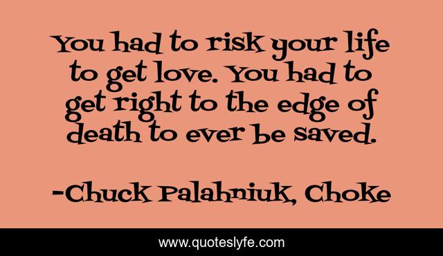 This page presents the quote "You had to risk your life to get love. You had to get right to the edge of death to ever be saved.". Author of this quote is Chuck Palahniuk, Choke. .