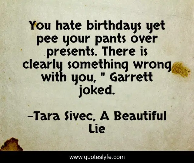 "Tara Sivec, A Beautiful Lie Quotes." Quoteslyfe.com, 2025. Fri. 05 Dec. 2025. <https://www.quoteslyfe.com/quote/You-hate-birthdays-yet-pee-your-pants-248765>.