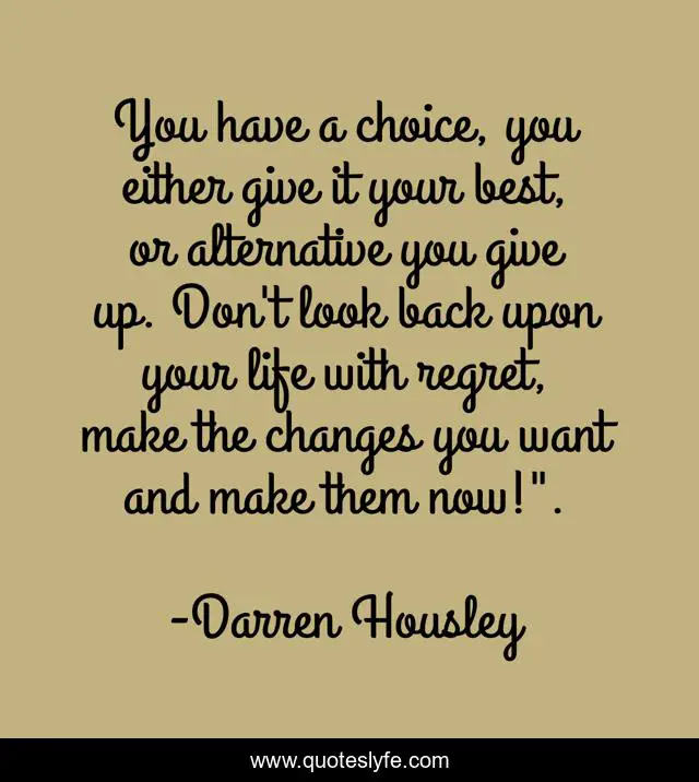This page presents the quote "You have a choice, you either give it your best, or alternative you give up. Don't look back upon your life with regret, make the changes you want and make them now!".". Author of this quote is Darren Housley. This quote is about life, change-your-life, choices, change-the-world, coaching, life-lessons, life-and-living,.