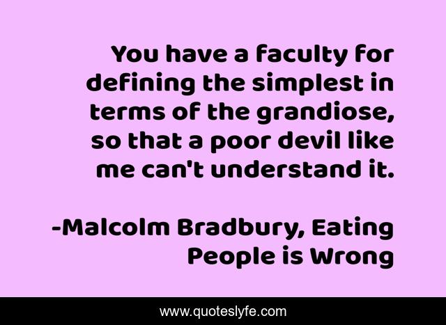 This page presents the quote "You have a faculty for defining the simplest in terms of the grandiose, so that a poor devil like me can't understand it.". Author of this quote is Malcolm Bradbury, Eating People is Wrong. This quote is about definition, grandiose, humor, verbosity, satire, understanding, simple-terms, eating-people-is-wrong, defining,.