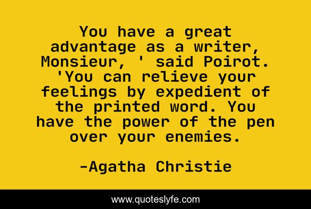 This page presents the quote "You have a great advantage as a writer, Monsieur, ' said Poirot. 'You can relieve your feelings by expedient of the printed word. You have the power of the pen over your enemies.". Author of this quote is Agatha Christie. This quote is about writers, writing-life,.