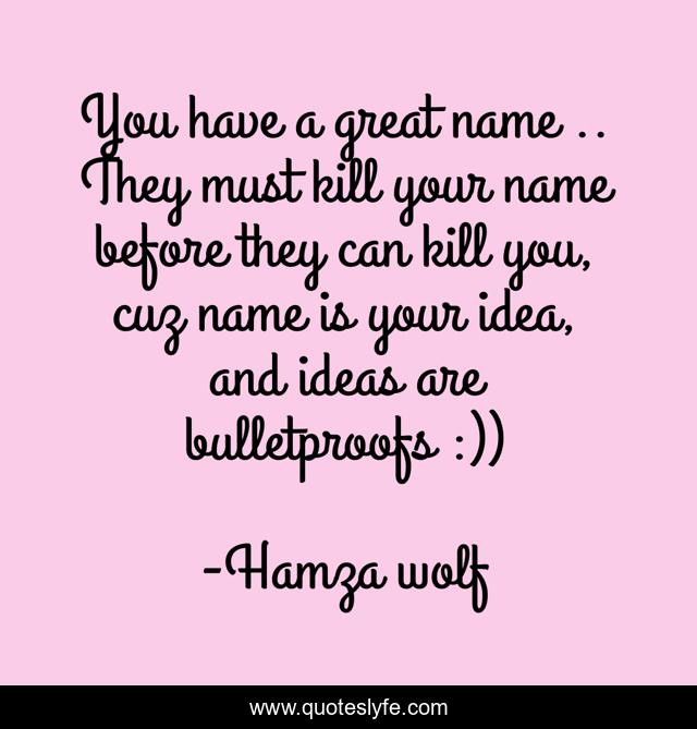 This page presents the quote "You have a great name .. They must kill your name before they can kill you, cuz name is your idea, and ideas are bulletproofs :))". Author of this quote is Hamza wolf. This quote is about glory, greatness,.