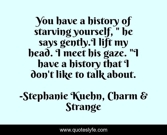 This page presents the quote "You have a history of starving yourself, " he says gently.I lift my head. I meet his gaze. "I have a history that I don't like to talk about.". Author of this quote is Stephanie Kuehn, Charm & Strange. This quote is about sadness, depression, eating-disorders, doctors,.