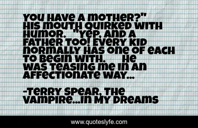 This page presents the quote "You have a mother?" His mouth quirked with humor. "Yep, and a father too! Every kid normally has one of each to begin with. He was teasing me in an affectionate way...". Author of this quote is Terry Spear, The Vampire...In My Dreams. This quote is about ya, paranormal-romance, witches, vampires,.