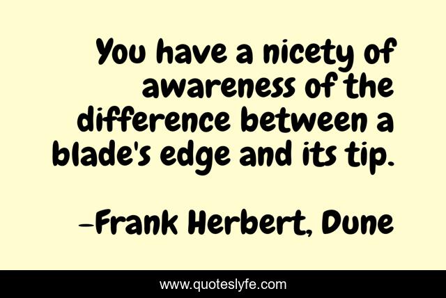This page presents the quote "You have a nicety of awareness of the difference between a blade's edge and its tip.". Author of this quote is Frank Herbert, Dune. This quote is about anger, patience, motivation, leadership, subtlety,.