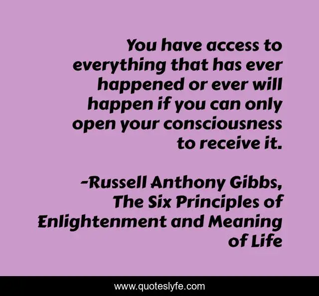 This page presents the quote "You have access to everything that has ever happened or ever will happen if you can only open your consciousness to receive it.". Author of this quote is Russell Anthony Gibbs, The Six Principles of Enlightenment and Meaning of Life. This quote is about access, everything, consciousness,.