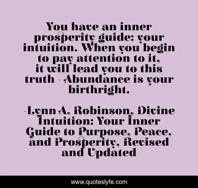 This page presents the quote "You have an inner prosperity guide: your intuition. When you begin to pay attention to it, it will lead you to this truth - Abundance is your birthright.". Author of this quote is Lynn A. Robinson, Divine Intuition: Your Inner Guide to Purpose, Peace, and Prosperity, Revised and Updated. This quote is about abundance, spirituality, intuition, divine-intuition, manifestation,.