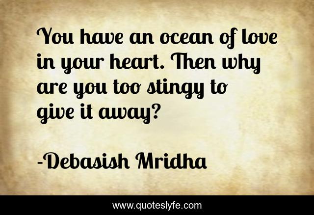 This page presents the quote "You have an ocean of love in your heart. Then why are you too stingy to give it away?". Author of this quote is Debasish Mridha. This quote is about stingy-to-give-it-away, love, mridha, debasish, debasish-mridha, affection, ocean-of-love, love-in-your-heart, philosophy,.