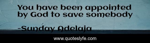 This page presents the quote "You have been appointed by God to save somebody". Author of this quote is Sunday Adelaja. This quote is about appointment, calling, fulfillment, save, salvation, purpose,.
