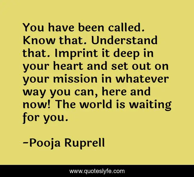 This page presents the quote "You have been called. Know that. Understand that. Imprint it deep in your heart and set out on your mission in whatever way you can, here and now! The world is waiting for you.". Author of this quote is Pooja Ruprell. This quote is about perseverance, passion, prayer,.