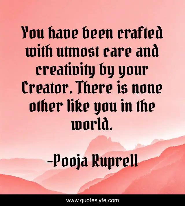 This page presents the quote "You have been crafted with utmost care and creativity by your Creator. There is none other like you in the world.". Author of this quote is Pooja Ruprell. This quote is about perseverance, passion, prayer,.