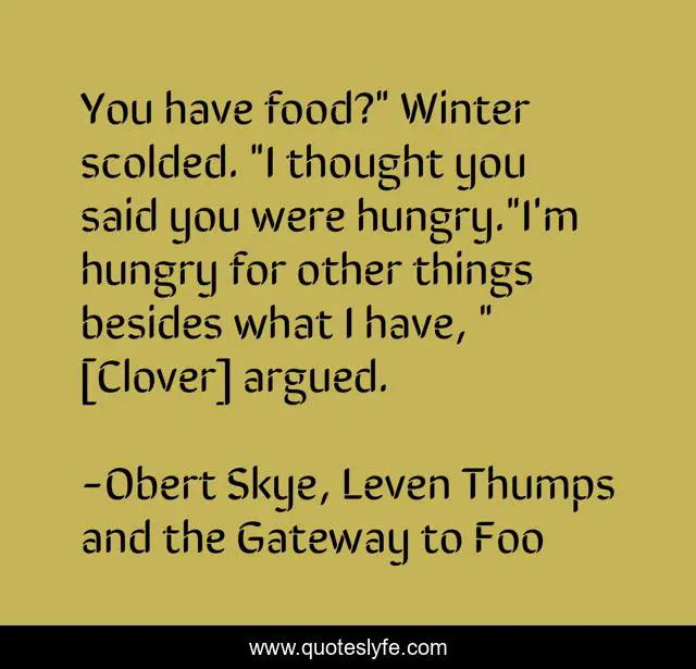 This page presents the quote "You have food?" Winter scolded. "I thought you said you were hungry."I'm hungry for other things besides what I have, " [Clover] argued.". Author of this quote is Obert Skye, Leven Thumps and the Gateway to Foo. This quote is about geth, clover, winter, funny, food, hungry, comedy,.