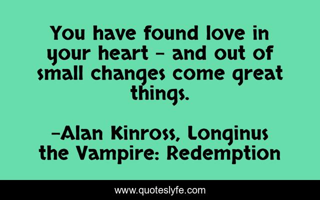 This page presents the quote "You have found love in your heart - and out of small changes come great things.". Author of this quote is Alan Kinross, Longinus the Vampire: Redemption. This quote is about love, heartbreak, redempion, atonement, sin, affection,.