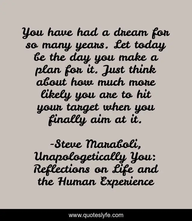 This page presents the quote "You have had a dream for so many years. Let today be the day you make a plan for it. Just think about how much more likely you are to hit your target when you finally aim at it.". Author of this quote is Steve Maraboli, Unapologetically You: Reflections on Life and the Human Experience. This quote is about confidence, plans, success, positive, motivational, optimistic, target, action, dreams,.