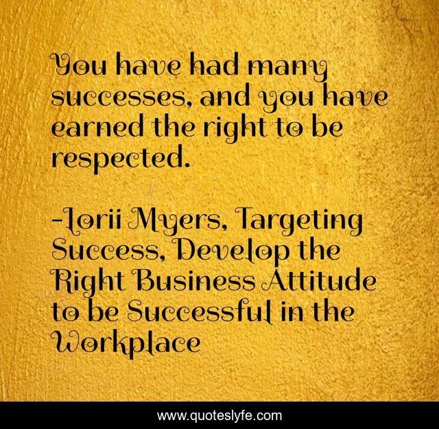 This page presents the quote "You have had many successes, and you have earned the right to be respected.". Author of this quote is Lorii Myers, Targeting Success, Develop the Right Business Attitude to be Successful in the Workplace. This quote is about respect, success,.