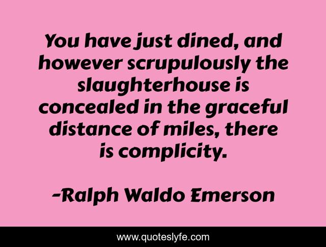 This page presents the quote "You have just dined, and however scrupulously the slaughterhouse is concealed in the graceful distance of miles, there is complicity.". Author of this quote is Ralph Waldo Emerson. This quote is about ethical, veganism, slaughterhouse, food, vegetarian, diet, vegan, vegetarianism, ethics,.