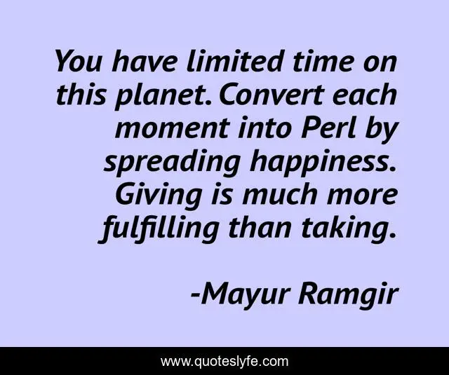 This page presents the quote "You have limited time on this planet. Convert each moment into Perl by spreading happiness. Giving is much more fulfilling than taking.". Author of this quote is Mayur Ramgir. This quote is about giving, happiness,.