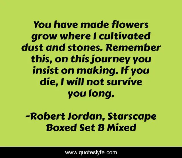 This page presents the quote "You have made flowers grow where I cultivated dust and stones. Remember this, on this journey you insist on making. If you die, I will not survive you long.". Author of this quote is Robert Jordan, Starscape Boxed Set B Mixed. This quote is about wheel, death, love, affection, time,.