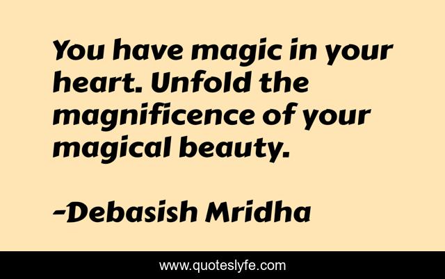 This page presents the quote "You have magic in your heart. Unfold the magnificence of your magical beauty.". Author of this quote is Debasish Mridha. This quote is about magical-beauty, magic, beauty, magic-in-your-heart, philosophy, debasish-mridha, quotes, inspirational, enthusiasm,.