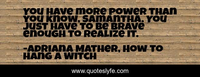 This page presents the quote "You have more power than you know, Samantha. You just have to be brave enough to realize it.". Author of this quote is Adriana Mather, How to Hang a Witch. This quote is about bravery, power,.