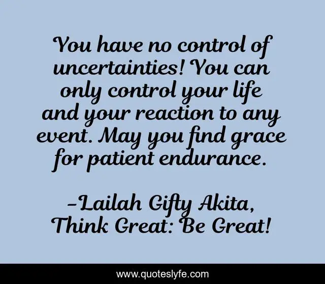 "Lailah Gifty Akita, Think Great: Be Great! Quotes." Quoteslyfe.com, 2025. Fri. 05 Dec. 2025. <https://www.quoteslyfe.com/quote/You-have-no-control-of-uncertainties-You-95081>.