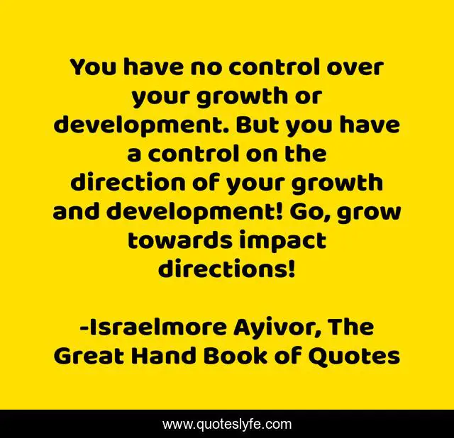 This page presents the quote "You have no control over your growth or development. But you have a control on the direction of your growth and development! Go, grow towards impact directions!". Author of this quote is Israelmore Ayivor, The Great Hand Book of Quotes. This quote is about control, development, direction, develop, leave-a-mark, impacts, impact, food-for-thought, direct,.