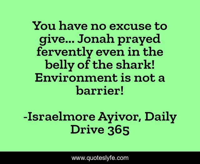 This page presents the quote "You have no excuse to give... Jonah prayed fervently even in the belly of the shark! Environment is not a barrier!". Author of this quote is Israelmore Ayivor, Daily Drive 365. This quote is about belly-of-the-shark, bible, barrier-israelmore-ayivor, fervent-prayer, food-for-thought, shark, jonah, environment, holy-bible,.
