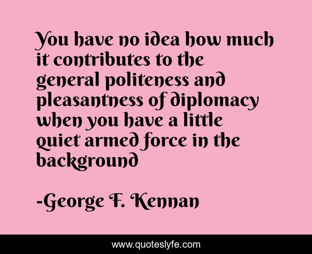 This page presents the quote "You have no idea how much it contributes to the general politeness and pleasantness of diplomacy when you have a little quiet armed force in the background". Author of this quote is George F. Kennan. This quote is about military, diplomacy,.