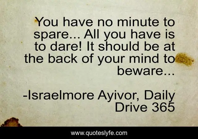 This page presents the quote "You have no minute to spare... All you have is to dare! It should be at the back of your mind to beware...". Author of this quote is Israelmore Ayivor, Daily Drive 365. This quote is about life, remember, success, seconds, beware, mind, food-for-thought, aware, spare,.