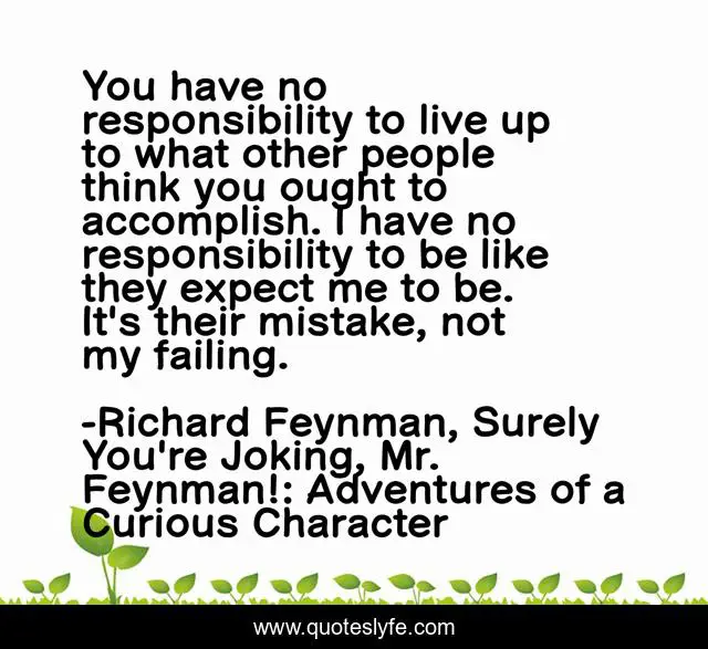 This page presents the quote "You have no responsibility to live up to what other people think you ought to accomplish. I have no responsibility to be like they expect me to be. It's their mistake, not my failing.". Author of this quote is Richard Feynman, Surely You're Joking, Mr. Feynman!: Adventures of a Curious Character. .