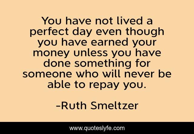 This page presents the quote "You have not lived a perfect day even though you have earned your money unless you have done something for someone who will never be able to repay you.". Author of this quote is Ruth Smeltzer. This quote is about day, one,.