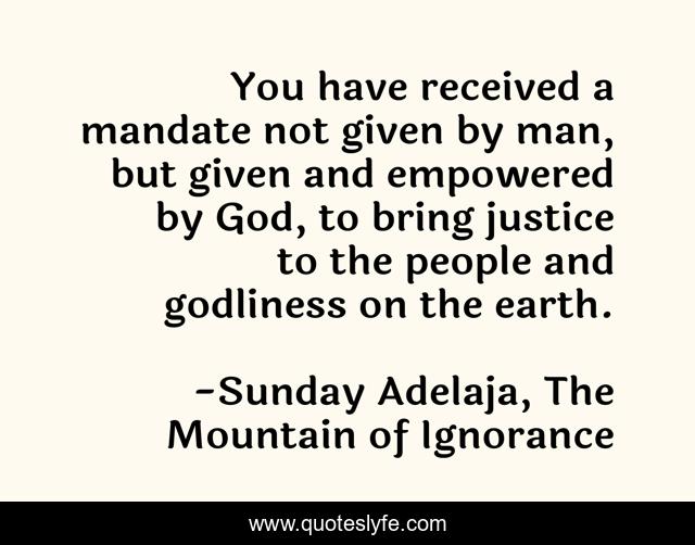 This page presents the quote "You have received a mandate not given by man, but given and empowered by God, to bring justice to the people and godliness on the earth.". Author of this quote is Sunday Adelaja, The Mountain of Ignorance. This quote is about mountain, empowerment, light, darkness, power, danger, justice, god, people,.