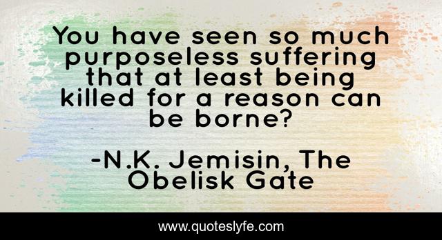 This page presents the quote "You have seen so much purposeless suffering that at least being killed for a reason can be borne?". Author of this quote is N.K. Jemisin, The Obelisk Gate. .