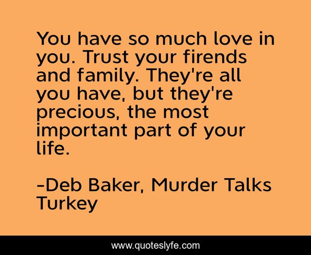 This page presents the quote "You have so much love in you. Trust your firends and family. They're all you have, but they're precious, the most important part of your life.". Author of this quote is Deb Baker, Murder Talks Turkey. This quote is about friends, trust, love, family, affection,.