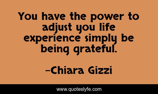 This page presents the quote "You have the power to adjust you life experience simply be being grateful.". Author of this quote is Chiara Gizzi. This quote is about gratitude, spirituality, gratitude-happiness-inner-peace, self-help,.