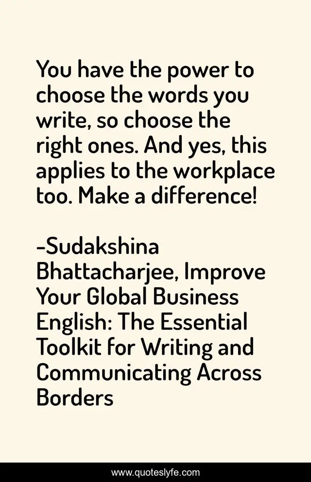 This page presents the quote "You have the power to choose the words you write, so choose the right ones. And yes, this applies to the workplace too. Make a difference!". Author of this quote is Sudakshina Bhattacharjee, Improve Your Global Business English: The Essential Toolkit for Writing and Communicating Across Borders. This quote is about business, communication-skills,.